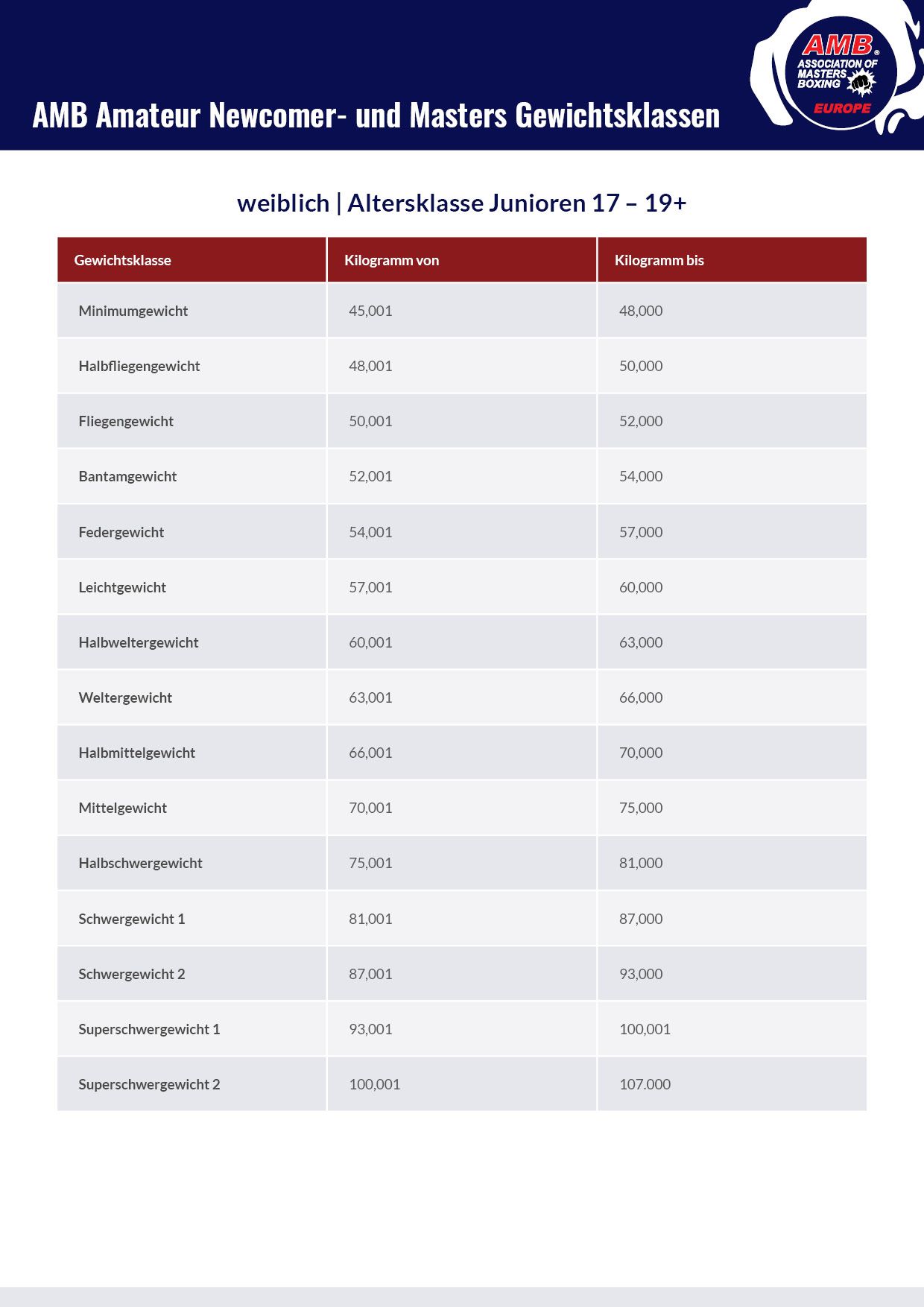 Alle aktuellen AMB-Gewichtsklassen (männlich/weiblich) sind im Anhang aufgeführt